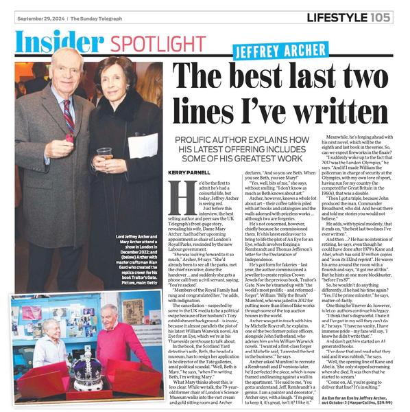 The Sunday Telegraph • 29th September 2024 Jeffrey Archer interview Jeffrey Archer chats about forgeries and his latest book.