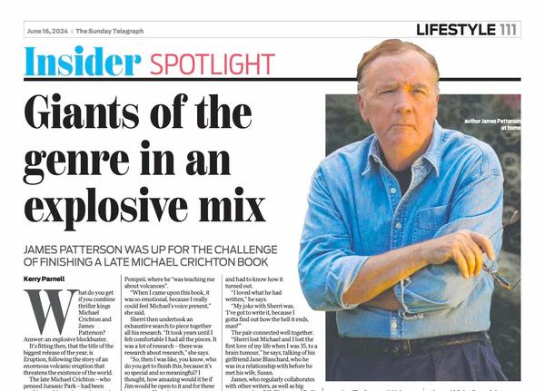 The Sunday Telegraph • 16th June 2024 James Patterson's explosive Michael Crichton story When Michael Crichton's unfinished manuscript is given to James Patterson, you are guaranteed a blockbuster.